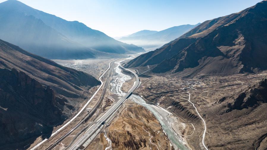 图为拉萨至那曲高等级公路沿线,道路从左到右依次为109国道、青藏铁路、高等级公路、乡村公路(2021年1月28日,无人机拍摄)。新华社记者晋美多吉 摄