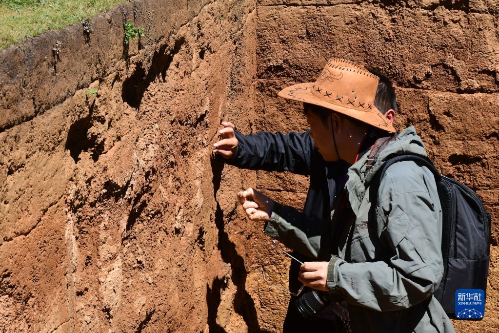 中国科学院院士、中国科学院青藏高原研究所所长陈发虎(前)在四川稻城皮洛遗址现场研究地层(9月12日摄)。新华社记者 谢佼 摄