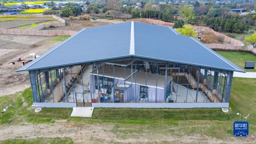 这是3月1日拍摄的三星堆遗址考古发掘现场保护大棚内的工作舱(无人机照片)。新华社记者 沈伯韩 摄