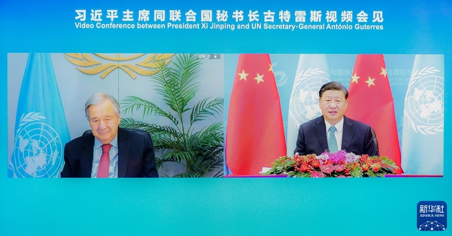 10月25日上午,国家主席习近平在北京人民大会堂以视频方式会见联合国秘书长古特雷斯。新华社记者 翟健岚 摄
