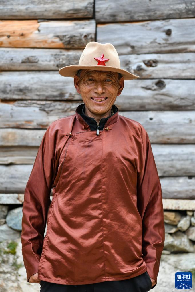 在四川省甘孜藏族自治州白玉县打乙西村,村党支部书记白玛扎西戴着镶好五角星的帽子留影。新华社记者王曦 摄