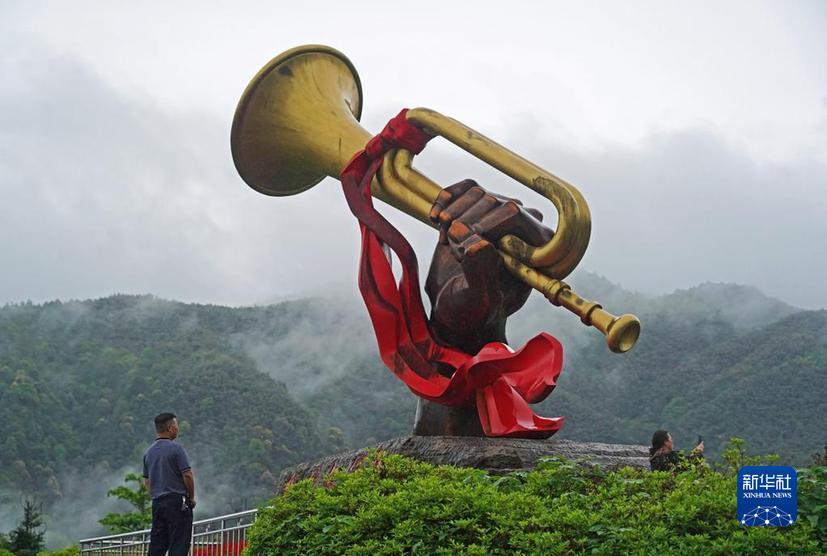 游客在井冈山参观“胜利的号角”雕塑(4月27日摄)。新华社记者 万象 摄