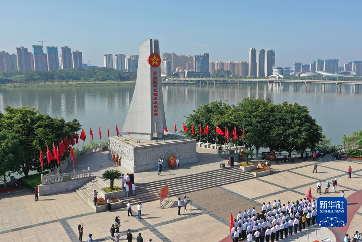 人们在江西省于都县中央红军长征出发纪念碑前参加纪念活动(4月30日摄,无人机照片)。新华社记者 万象 摄