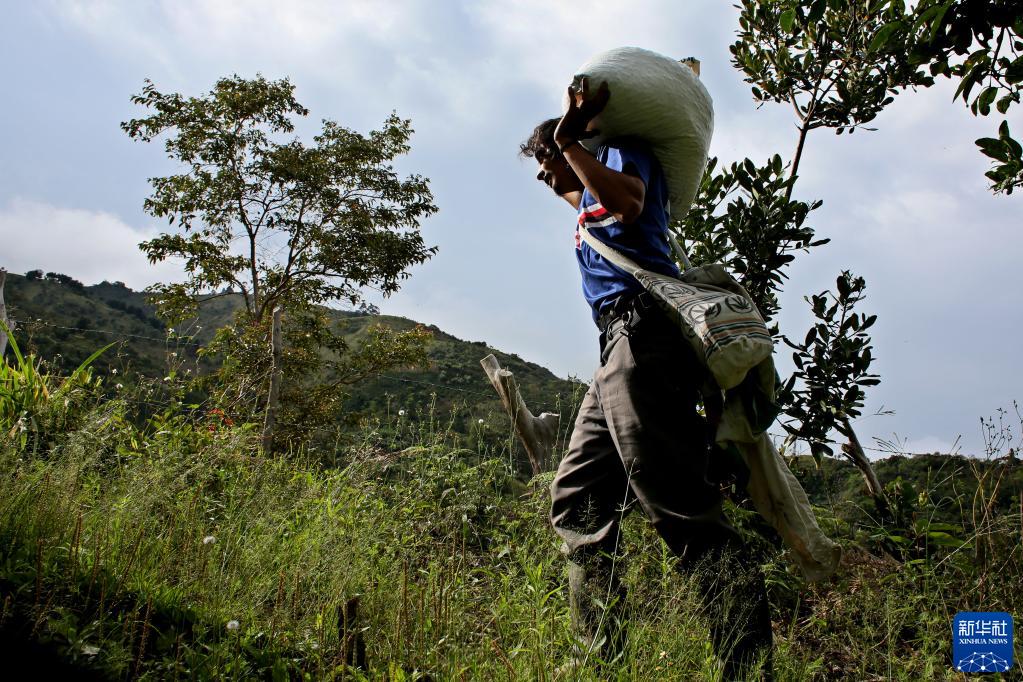 10月26日,农民在哥伦比亚安蒂奥基亚省希拉尔多一处咖啡种植园搬运采摘下的咖啡果。新华社发