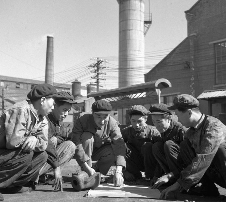图为沈阳铸造厂开展科学普及工作,第二车间技术员、科普小组组员张玉生(右四)利用休息时间帮助工人学习看图(1956年10月24日发)。 新华社记者于肇 摄
