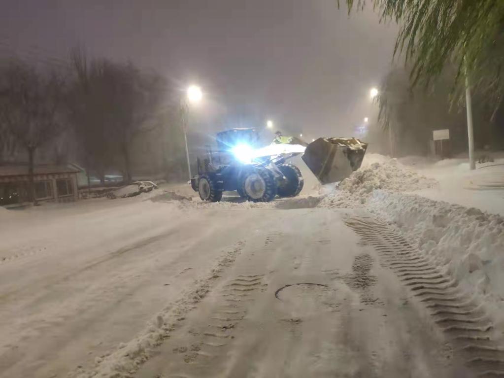 11月8日凌晨,通辽市科尔沁区有关工作人员驾驶铲车清理积雪。(通辽市科尔沁区融媒体中心供图)