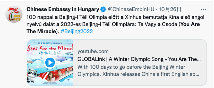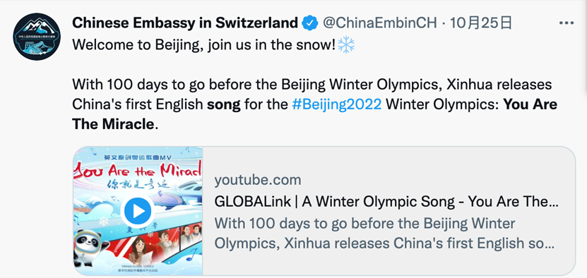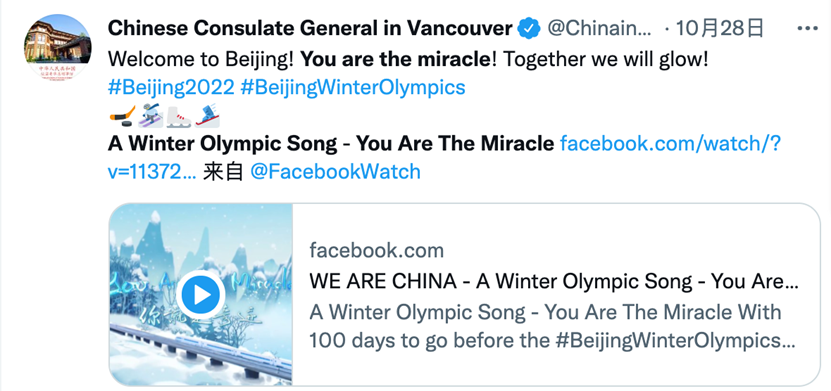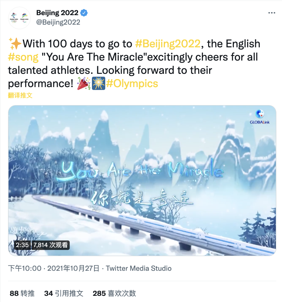举世瞩目的2022年北京冬奥会还有两个多月就开幕了。一首由国社原创,奥运冠军杨扬、丁宁、林跃领衔演唱的迎冬奥英文MV《你就是奇迹(You Are the Miracle)》在海内外网络迅速走红,发布一个月以来,在各社交媒体平台热度颇高,受到大量海外网友的喜爱,在优兔、脸谱、推特等海外社交平台获得广泛关注,浏览量超千万次。北京冬奥组委第一时间在海外官方账号转发,海外网友留言表示“终于等到了!”