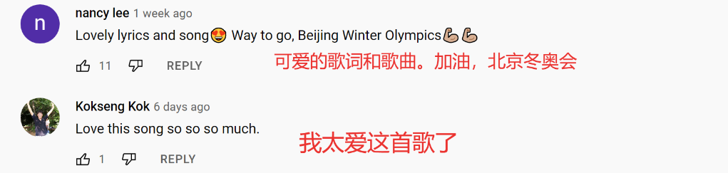海外网友则纷纷点赞英文歌词,歌词中“在一起我们更加闪亮”与本届冬奥会主题口号“一起向未来”相呼应。一位马来西亚网友在中国驻马来西亚大使馆的脸谱账号看到这首歌,被歌曲表达的满满的正能量所感动,留言"Bring the WORLD closer"(让世界更紧密地团结在一起)。