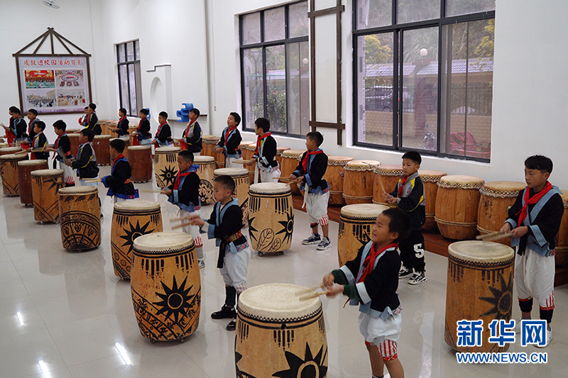 南丹县里湖瑶族乡中心小学学生表演皮鼓技艺。新华网 刘君 摄