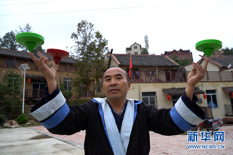 白裤瑶打陀螺项目代表性传承人何光斌在展示陀螺技艺。新华网 刘君 摄