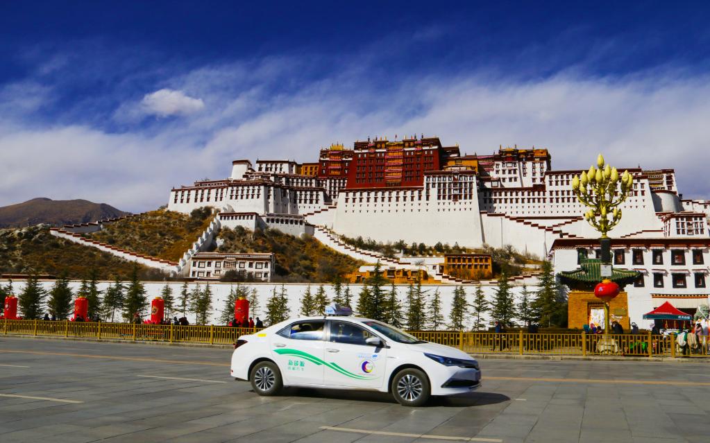 新能源出租车从布达拉宫广场前驶过(2018年2月11日摄)。 新华社发 央梅朵 摄