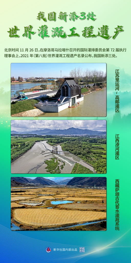 新华社北京11月26日电(记者刘诗平)江苏里运河-高邮灌区、江西潦河灌区、西藏萨迦古代蓄水灌溉系统26日成功入选2021年度(第八批)世界灌溉工程遗产名录。至此,我国的世界灌溉工程遗产达到26处。