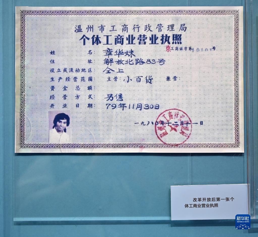 这是在 “伟大的变革——庆祝改革开放40周年大型展览”上拍摄的改革开放后第一张个体工商业营业执照(2018年11月15日摄)。新华社记者 李鑫 摄