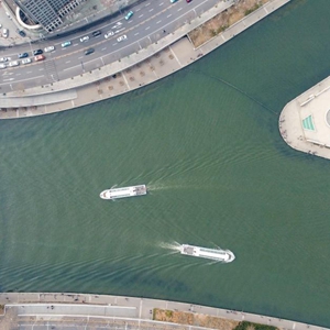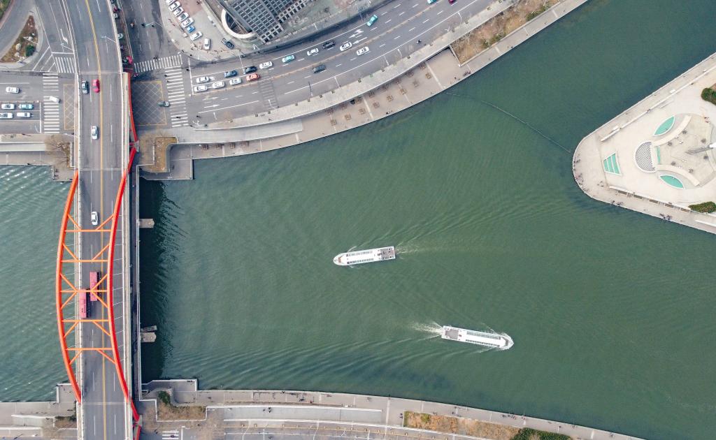 这是无人机从空中拍摄的游船在天津海河三岔河口航行(3月19日摄)。新华社记者孙凡越摄