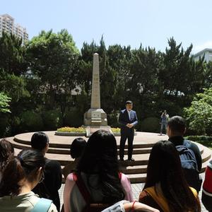 在上海交通大学校园里的史霄雯、穆汉祥烈士墓前,刘统教授在讲述两位烈士牺牲的历史经过(2019年5月7日摄)。