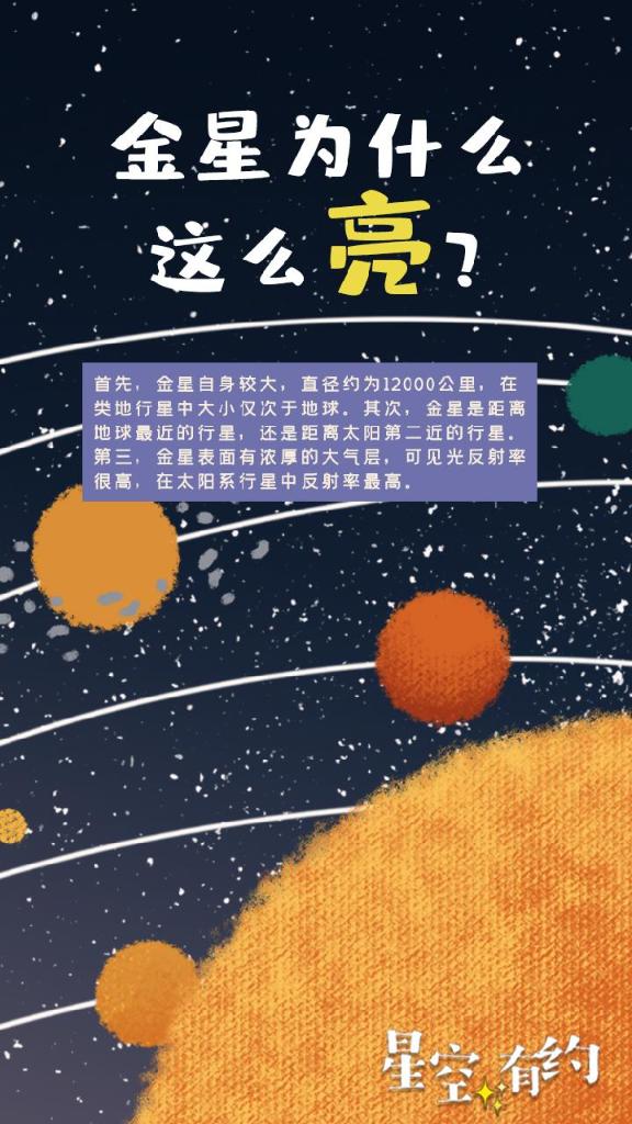 金星为什么这么亮?中科院紫金山天文台科普主管王科超解释说,首先,金星自身较大,直径约为1.2万公里,在类地行星中大小仅次于地球;其次,金星是距离地球最近的行星,还是距离太阳第二近的行星;第三,金星表面有浓厚的大气层,可见光反射率很高,在太阳系行星中反射率最高。