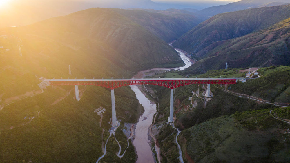 ↑这是2021年9月27日拍摄的中国云南省中老铁路元江特大桥(无人机照片)。