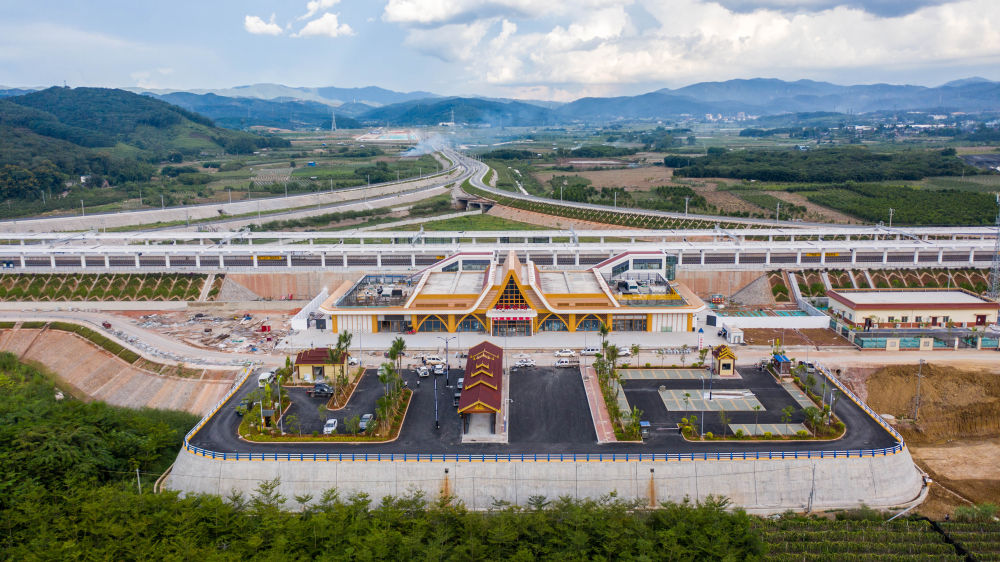 ↑这是2021年9月29日拍摄的中国云南省中老铁路野象谷车站(无人机照片)。