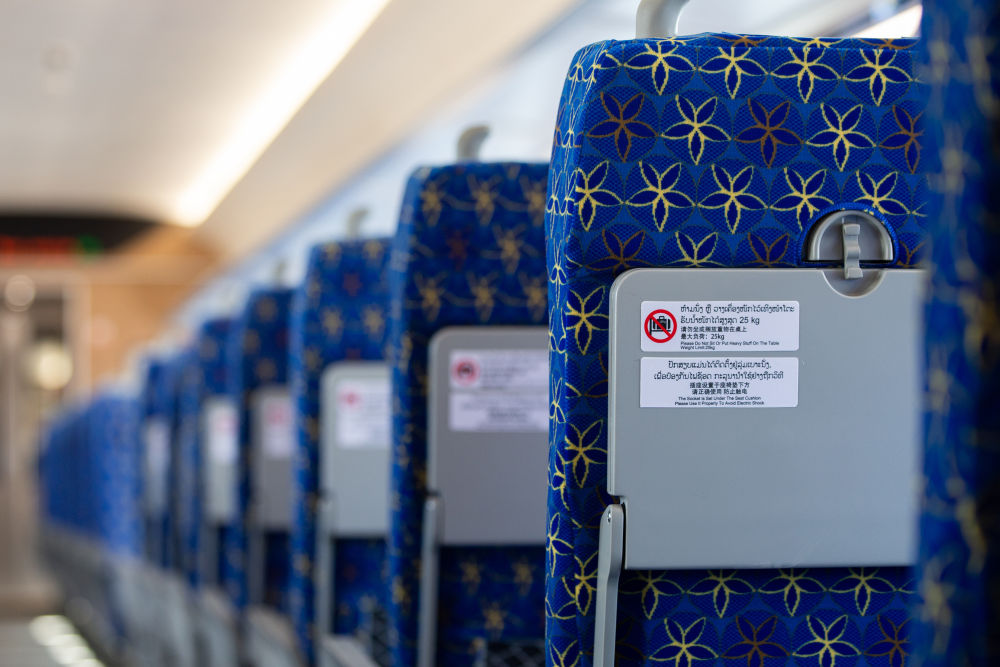 ↑这是2021年11月21日拍摄的“澜沧号”动车组座椅。装饰采用老挝国花占芭花图案。