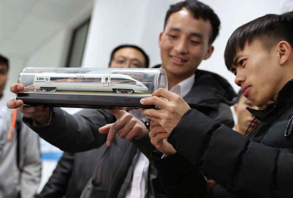 ↑2019年3月26日,中国上海应用技术大学铁道工程专业老挝留学生查看高铁列车模型。