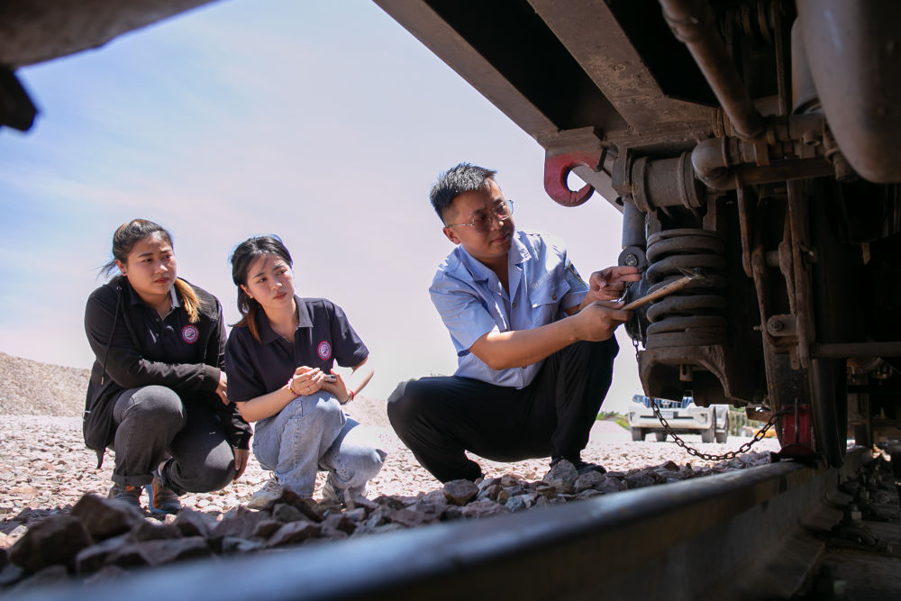 ↑2021年9月12日,在老挝首都万象北郊的中国中铁二局中老铁路铺轨基地,老挝学员跟着中国师傅(右)检查列车。