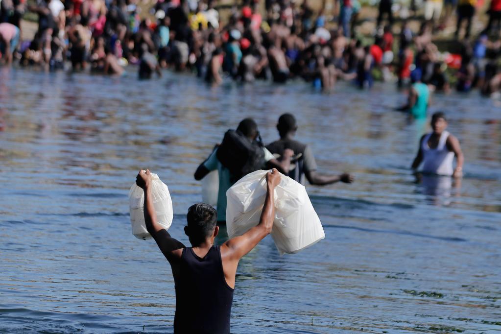 9月19日在墨西哥科阿韦拉州阿库尼亚城拍摄的照片显示,一名非法移民提着从墨西哥一侧购买的食物走过美墨边境的里奥格兰德河。新华社发