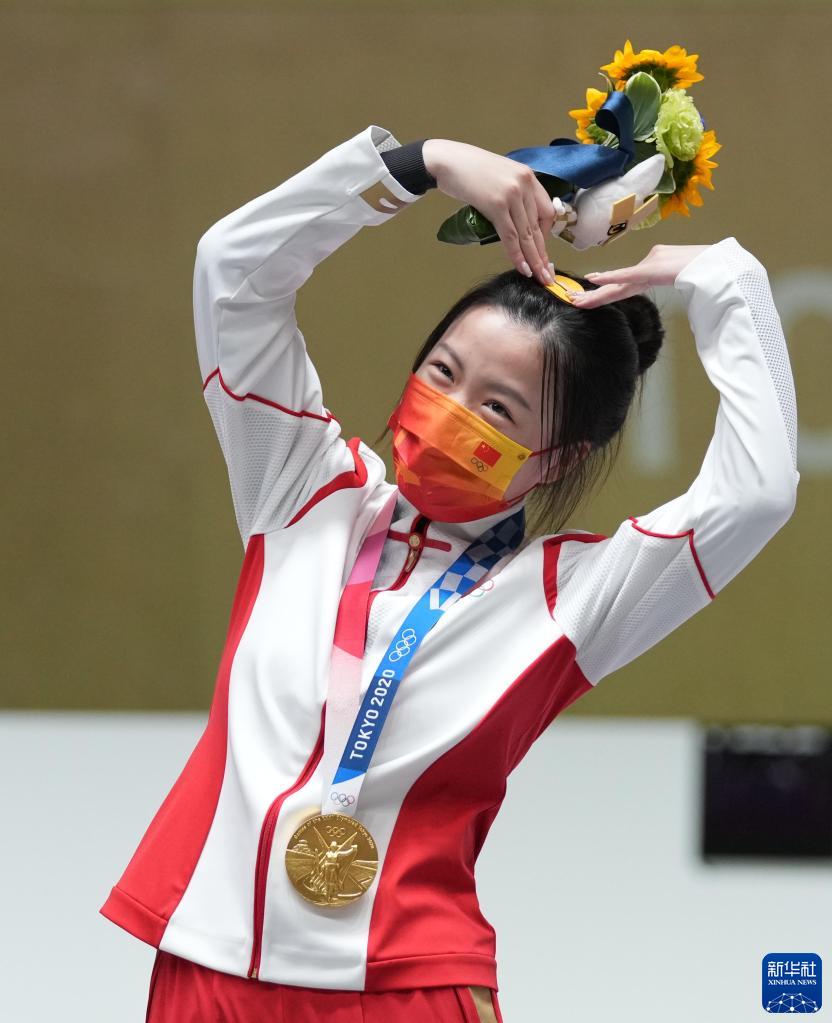 这是2021年7月24日,中国选手杨倩在东京奥运会射击女子10米气步枪决赛中赢得东京奥运会首枚金牌后,在颁奖仪式上庆祝。新华社记者 鞠焕宗 摄