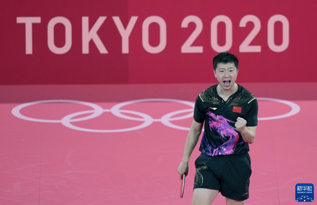 这是2021年7月30日,中国选手马龙在东京奥运会乒乓球男子单打决赛中庆祝得分。新华社记者 王毓国 摄