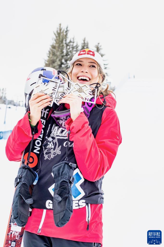这是2021年1月30日,中国选手谷爱凌在美国阿斯彭举行的2021世界极限运动会X Games冬季赛后展示斩获的两金一铜奖牌。新华社发