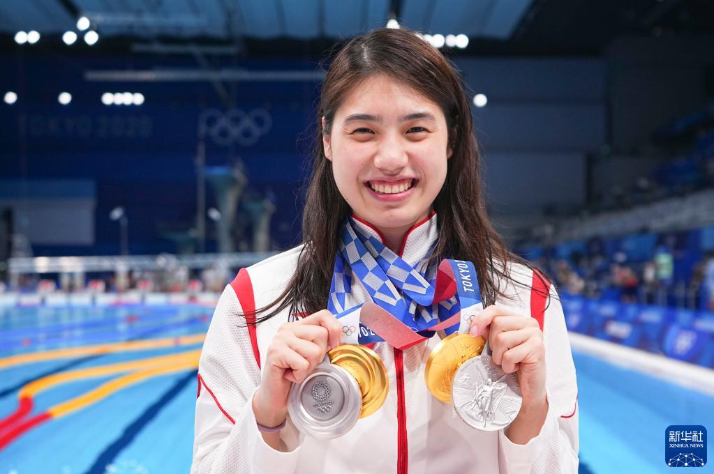 这是2021年8月1日,东京奥运会游泳赛事落下帷幕,中国选手张雨霏展示她在女子200米蝶泳、女子4X200米自由泳接力项目中收获的两枚金牌,以及在女子100米蝶泳和男女混合4X100米混合泳接力项目中收获的两枚银牌。新华社记者 许畅 摄