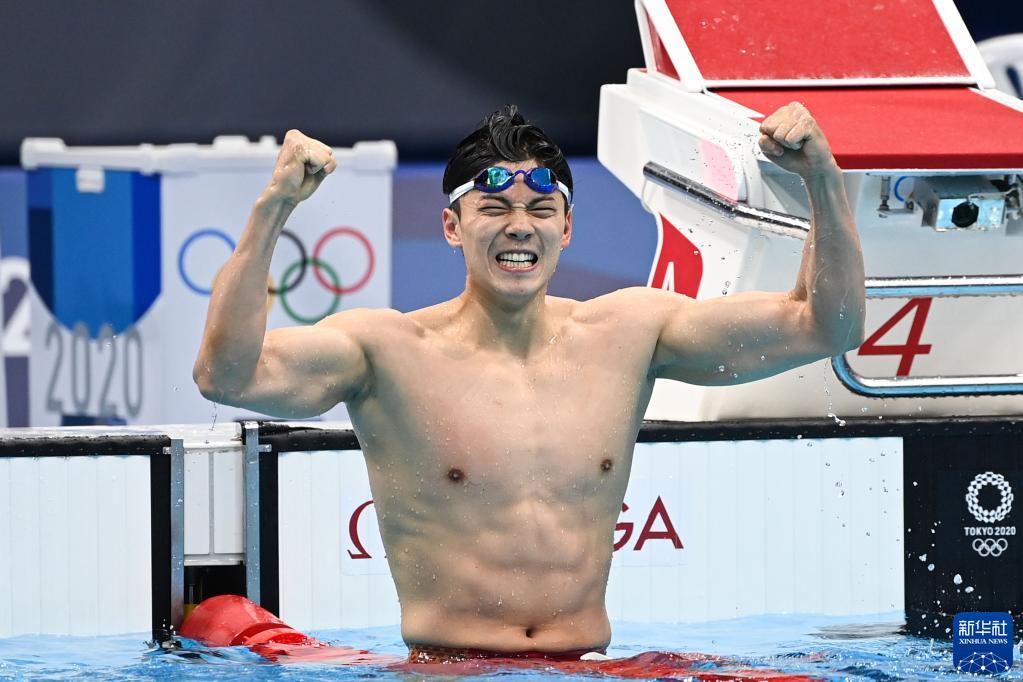 这是2021年7月30日,中国选手汪顺在东京奥运会游泳男子200米个人混合泳决赛中夺冠后庆祝。新华社记者 杜宇 摄