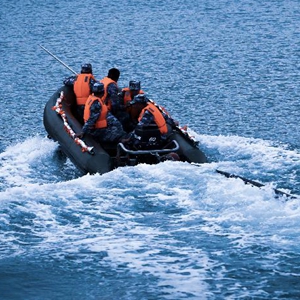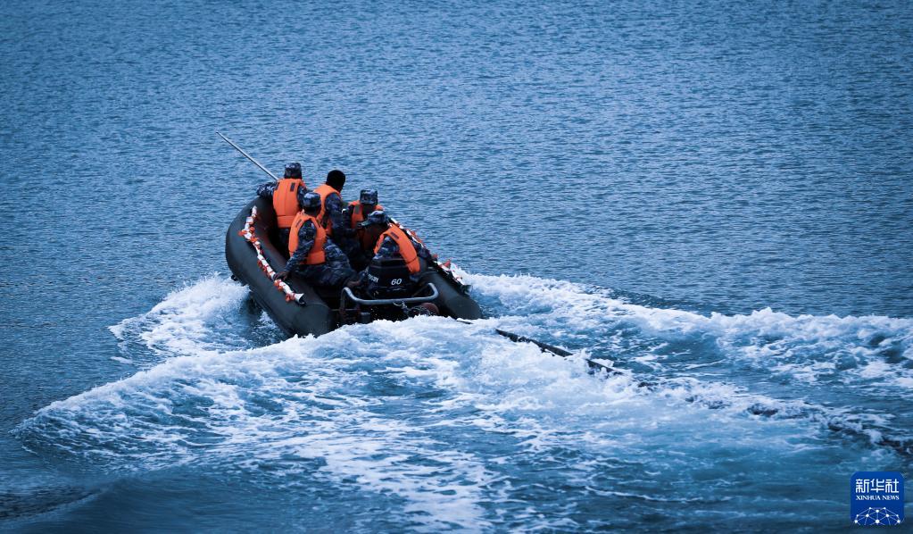 1月4日,南部战区海军某综合保障基地组织岸滩无码头油料补给训练,官兵驾驶小艇前出进行油管布设。新华社发(韩启洲摄)