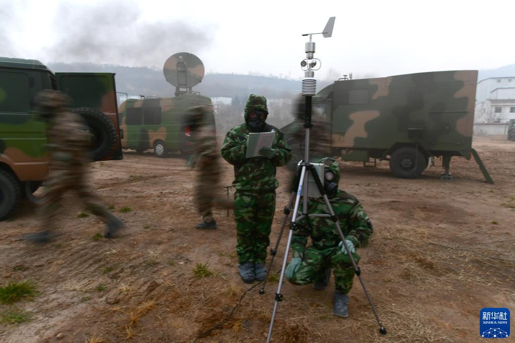 1月4日,火箭军某部气象分队官兵在训练场进行全防护状态下应急气象保障演练。新华社发(赵吉垒摄)