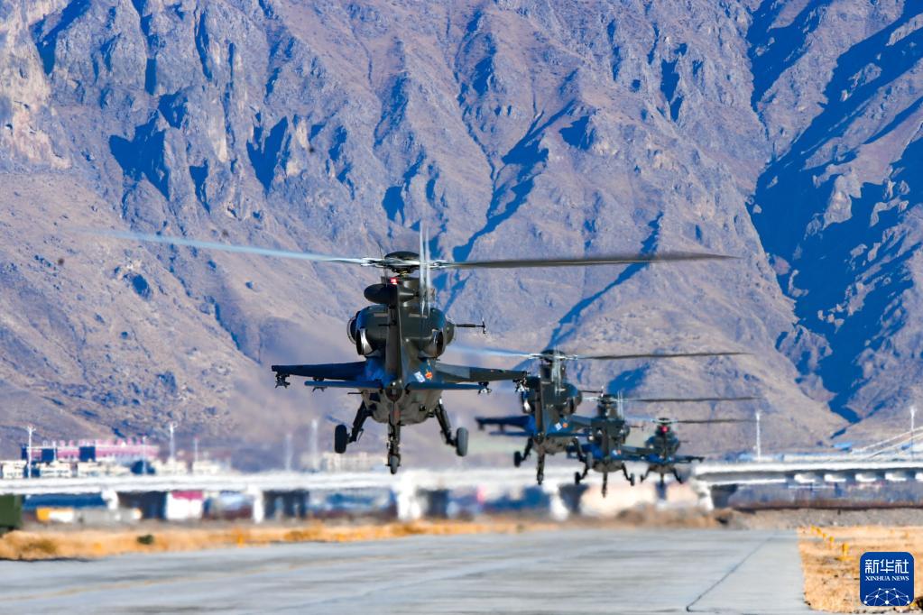 1月4日,在海拔3600多米的某演训场,西藏军区某陆航旅直升机编队起飞。新华社发(吴国龙摄)