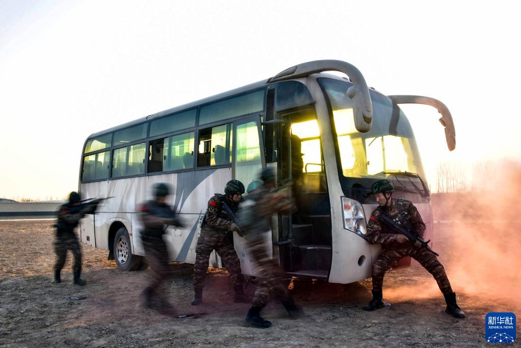 1月4日,武警北京总队执勤第四支队特战队员开展公交车反劫持训练。新华社发(姜润邈摄)