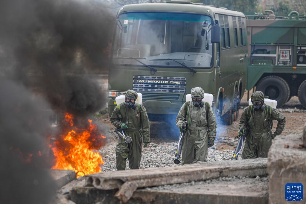1月4日,武警重庆总队机动支队开展应急救援综合演练,防化分队官兵对“染毒”区域进行消杀。新华社发(王肸摄)