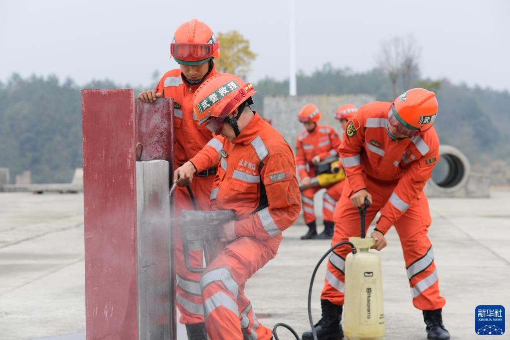 1月4日,武警江西总队机动支队组织救援专业训练,工兵中队官兵在切割水泥墙。新华社发(曹先训摄)