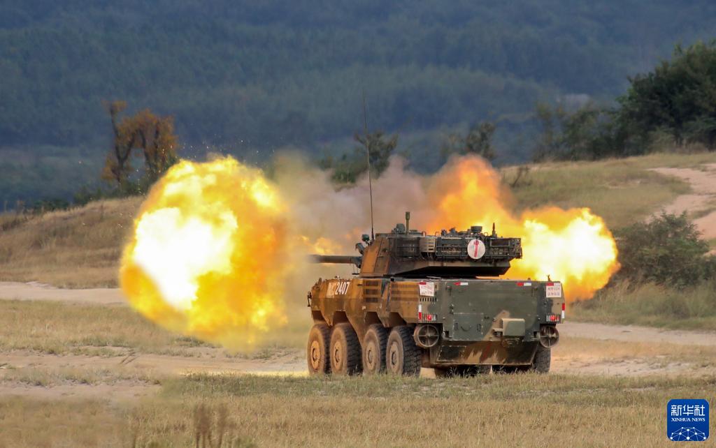 1月4日,陆军第72集团军某旅官兵驾驶某型轮式突击车进行实弹射击。新华社发(张毛摄)