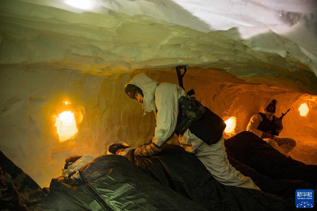 1月4日,北部战区陆军某边防旅东极哨所组织武装奔袭20公里,官兵在雪洞内野外宿营。新华社发(高翔昊摄)