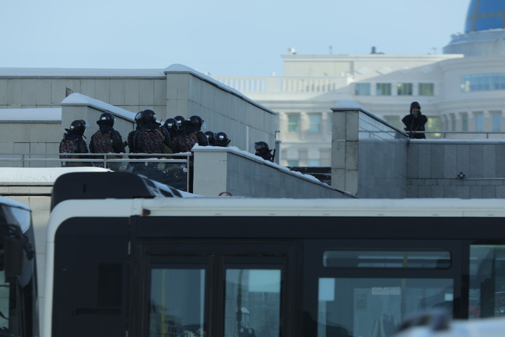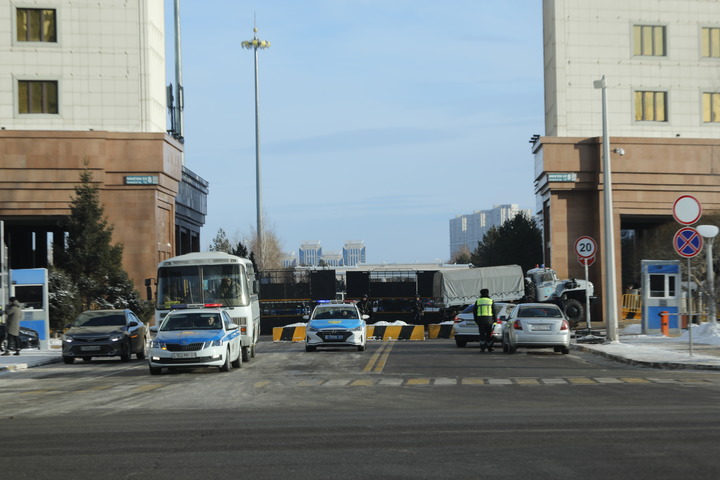 1月6日,警察在位于哈萨克斯坦首都努尔苏丹的政府机构前实施戒严。新华社发(奥斯潘诺夫摄)
