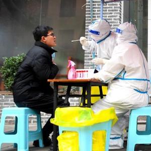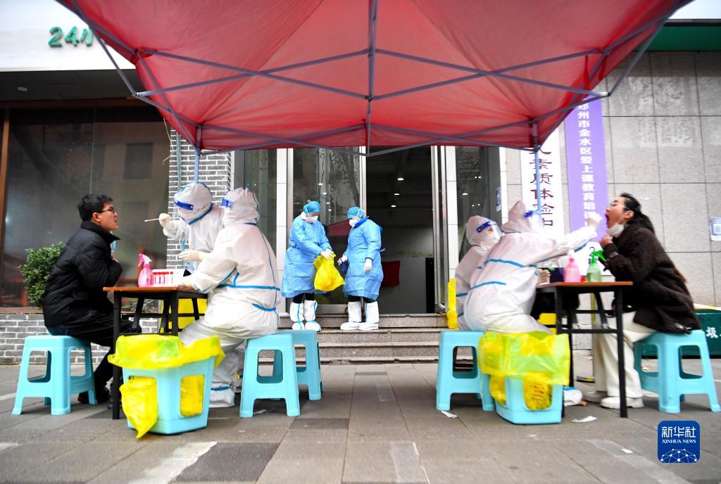 1月10日,人们在郑州市纬一路一核酸检测点接受核酸检测取样。