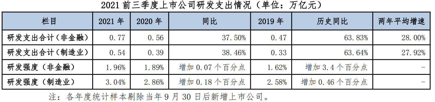 2021年前三季度,非金融实体类上市公司研发支出合计0.77万亿元,同比增长37.50%,较2019年同期增长63.83%,两年平均28%。研发支出占营业收入1.96%,较上一年增加0.07个百分点,较2019年同期增加3.4个百分点。制造业上市公司研发支出合计0.54万亿元,同比增长38.46%,与2019年同期增长63.64%,两年平均27.92%。制造业研发支出占营业收入3.04%,较上一年增加0.18个百分点,较2019年同期增加0.46个百分点。