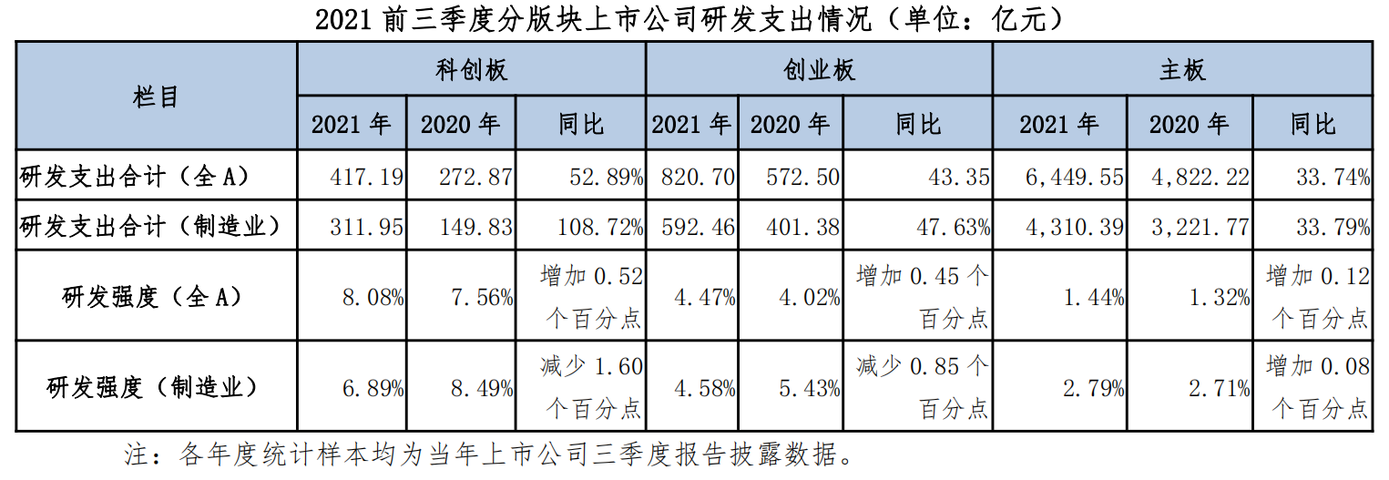 2021年前三季度,科创板、创业板制造业公司研发支出分别同比增长108.72%和47.63%,研发强度分别为6.89%和4.58%。主板制造业公司前述指标为33.79%和2.79%,远低于两创板块。研发强度排名前十的公司中,5家为生物制药、医疗器械行业公司,神州细胞、泽璟制药、寒武纪、前沿生物等6家公司研发支出占比超过100%,神州细胞更是高达5,096.67%。