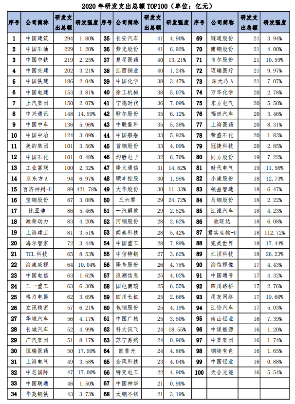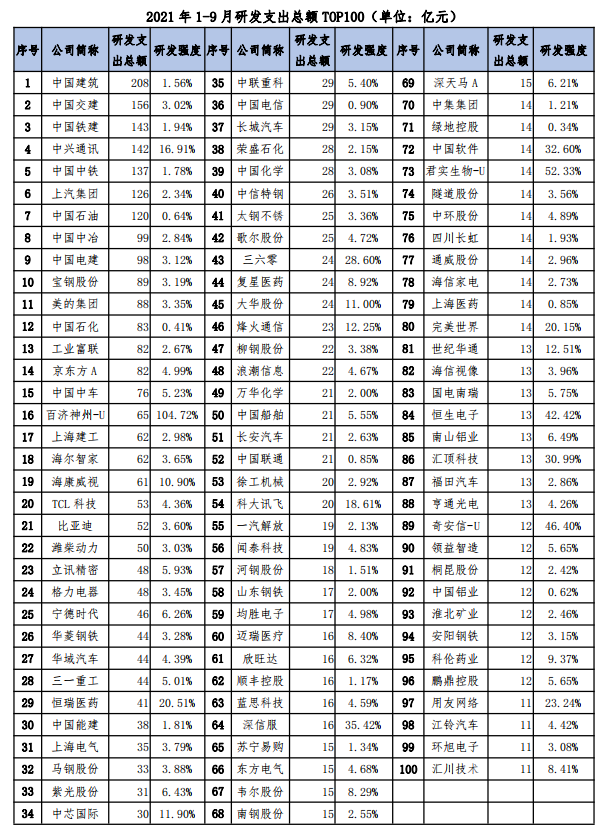 2021年前三季度研发支出总额前百企业共投入研发资金3,744亿元。其中,研发资金投入超过100亿的企业共7家,分别是中国建筑(208亿)、中国交建(156亿)、中国铁建(143亿)、中兴通讯(142亿)、中国中铁(137亿)、上汽集团(126亿)、中国石油(120亿)。