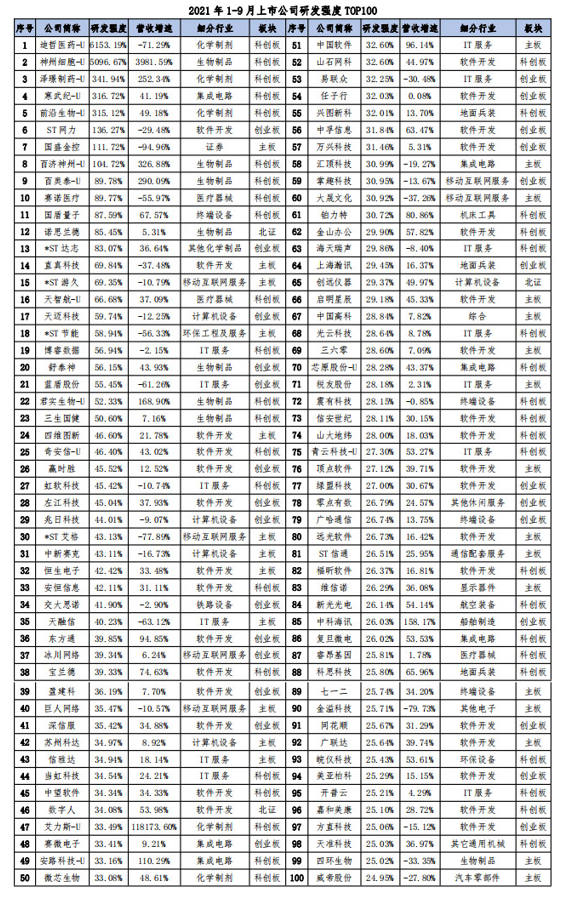 2021年前三季度研发强度前百企业的平均研发强度为160.63%,中位数为32.84%。其中研发强度超过1,000%的共有2家,分别是迪哲医药-U(6,153.19%)和神州细胞-U(5,096.67%),研发强度超过100%的企业共有6家,分别是泽璟制药-U(341.94%)、寒武纪-U(316.72%)、前沿生物-U(315.12%)、ST网力(136.27%)、国盛金控(111.72%)、百济神州-U(104.72%)。研发强度前百企业的门槛为24.95%。