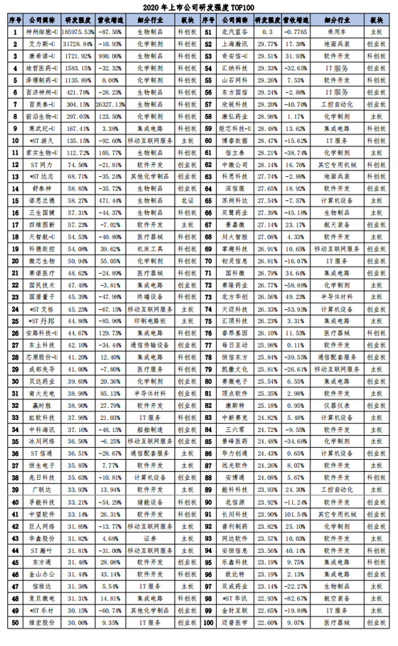 从行业分布看,研发强度前百企业主要来自于软件开发业32家、IT服务业13家、生物制品业8家。从板块看,研发强度前百企业主要集中在科创板(42家)和创业板(27家)。此外,北交所也有3家企业入围。具体情况如下: