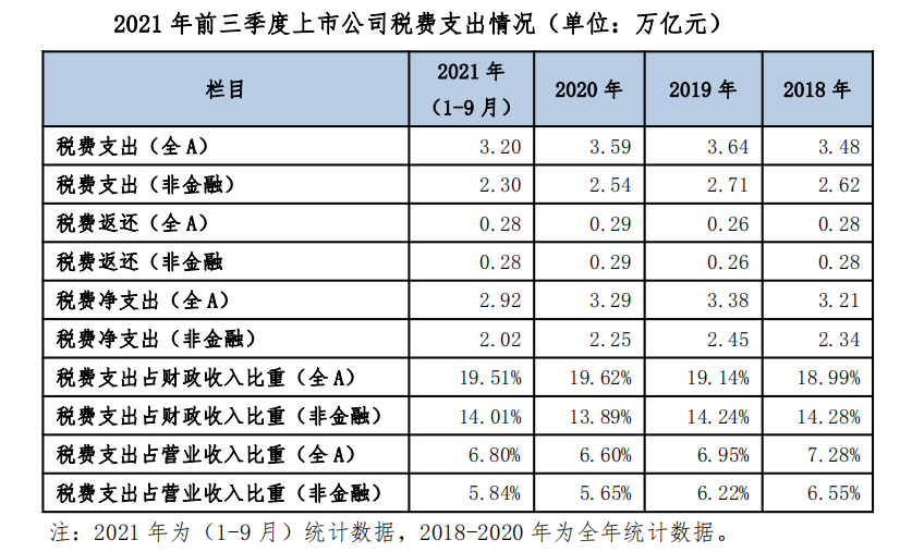“两桶油”“四大行”税费贡献突出,2021年前三季度,税费支出合计近万亿元。随着助企纾困、减税降费等政策有力推进,上市公司税费支出规模总体平稳,税费支出占营收比由2018年的7.28%降至2021年三季度的6.80%,非金融实体类公司降幅更为明显,三季度降至5.84%。