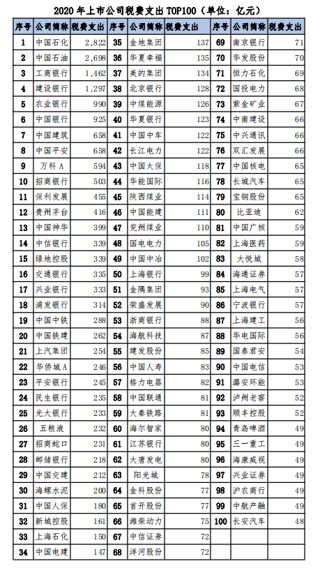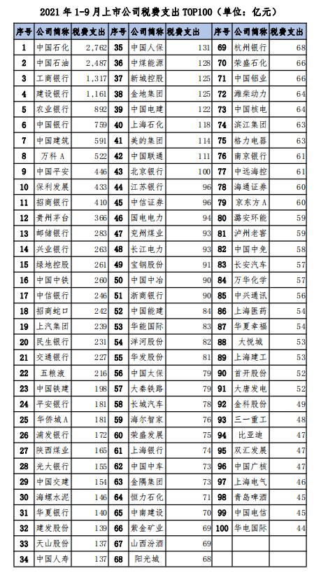 2021年前三季度税费缴纳前百企业共上缴税费21,398亿,占全部公司约三分之二。其中,缴纳税费超过1,000亿元的企业共4家,分别是中国石化(2,762亿)、中国石油(2,487亿)、工商银行(1,317亿)、建设银行(1,161亿)。