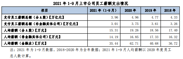 2018年以来上市公司支付员工薪酬持续增加,由4.33万亿元增至4.96万亿元,年均增幅2.23%。2021年1-9月上市公司员工薪酬合计3.96万亿元,年度总额预计超过2020年。制造业公司由于数量多,薪酬总额居各行业之首,金融业次之。人均薪酬水平金融业近三年均为各行业最高,制造业处于中下游水平,农林牧渔业人均薪酬最低。