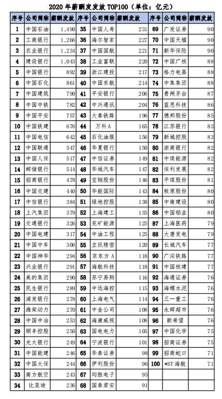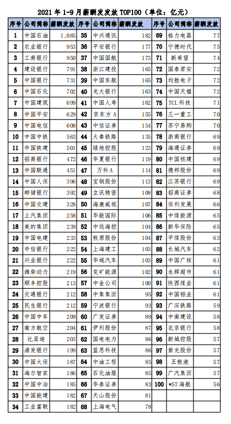 2021年前三季度薪酬发放前百企业共支出员工薪酬20,092亿。其中超过1,000亿元的企业共1家,为中国石油(1,085亿)。发放薪酬在1,000亿元至500亿元的企业共10家,分别是农业银行(953亿)、工商银行(950亿)、建设银行(791亿)、中国银行(731亿)、中国石化(702亿)、中国建筑(699亿)、中国平安(629亿)、中国电信(608亿)、中国中铁(563亿)、中国铁建(501亿)。